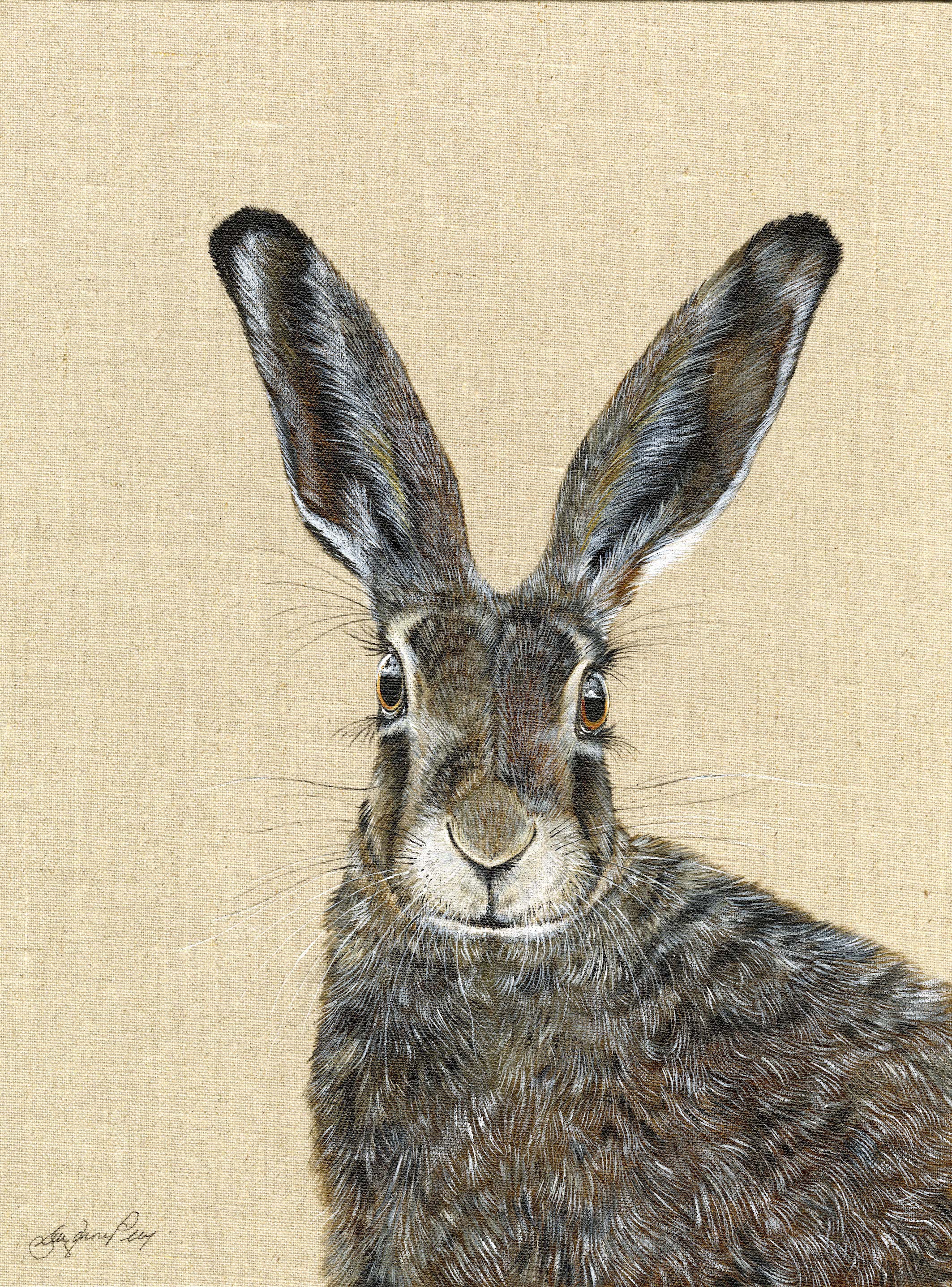 This Hare design is on Loxley clear primed linen canvas board. The linen fabric is laminated on to rigid, high quality medium density fibre board, which suits my style of painting perfectly. The texture is obviously very different from the Crescent Board that I have been using for a long time and I am pleased how easily it has been to adapt. The look of the linen seems to complement my style of painting.