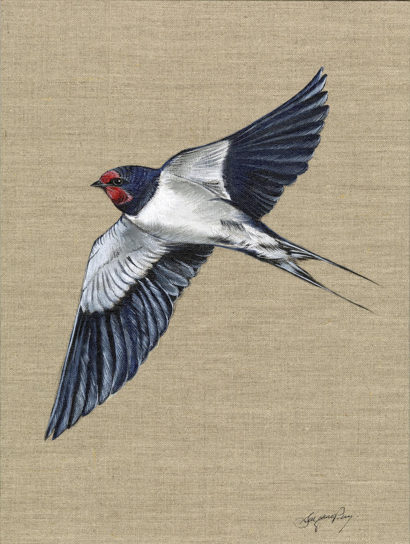 Framed 16" x 12" with non reflective glass This Swallow in Flight design is on Loxley clear primed linen canvas board.  The linen fabric is laminated on to rigid, high quality medium density fibre board, which suits my style of painting perfectly.  The texture is obviously very different from the C ...Read more