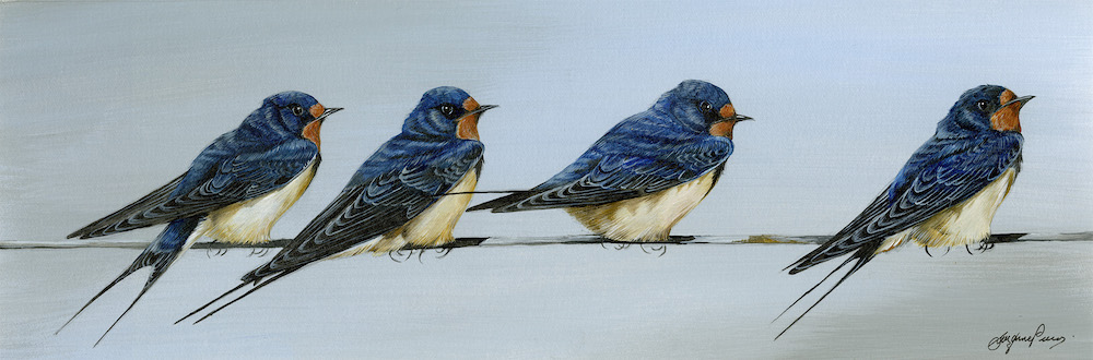 Framed Size 9" x 21", with non reflective glass. One of my earliest paintings since publishing my website was Swallows United and it is rapidly coming to the end of its limited 25 print run. It has taken some time to re-visit these happy little fellows as they join us each summer. This new painting is even more detailed and the subjects are set against a full colour block. Price £180.00. SOLD at Birdfair 2019.