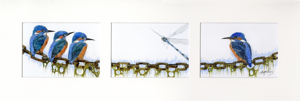 Framed size 9" x 21", with non reflective glass.   Following the success of my ever popular kingfisher work, I decided to paint a three linked picture this time, each bird perched on a rusty chain, pondering the hovering damselfly in between. Price £140.00.  SOLD at Brett Gallery, Monks Eleigh, Suffolk, it became a wedding gift I understand.  This was an unusual idea, which seemed to fascinate the buyer.