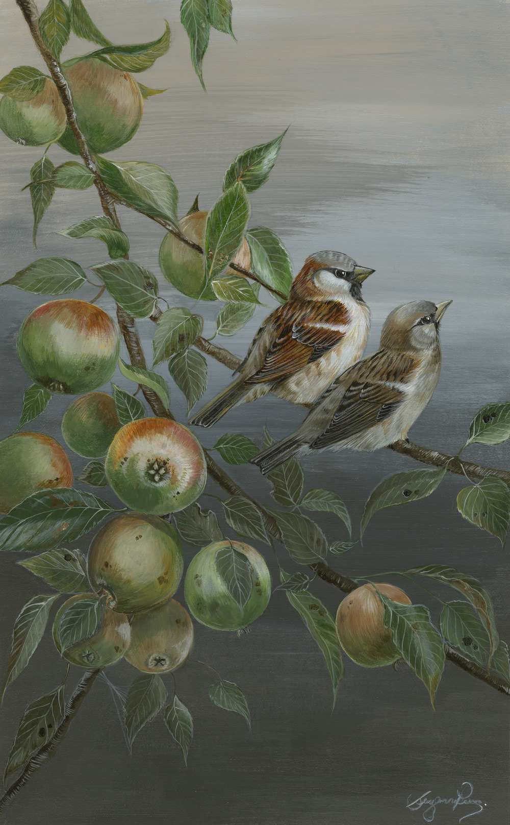 Framed Size 18" x 12", with non reflective glass. Although they are far from the jewel coloured Kingfisher, I pretty much have to put down every shade of brown I have on the palate as well as grey, yellow ochre and buff titanium. Intrigued by the title?! Pairs of sparrows are a symbol of love and sparrows would catch the souls of the recently deceased and carry them to heaven...... Soul Love seemed an apt choice and it is a fitting tribute to David Bowie. They are now Red Listed. Read more......RSPB House Sparrow