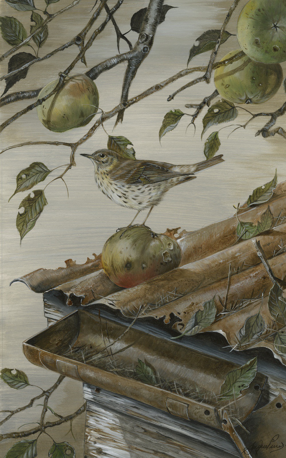 Framed Size 18" x 12", with non reflective glass.  A familiar and popular garden song bird.  While I was researching the Song Thrush I was saddened to learn that it is a Red List species.  Passage from The Darkling Thrush by Thomas Hardy......At one a voice arose among the bleak twigs.....In a full-hearted evensong of joy unlimited.....An aged Thrush, frail, gaunt and small, in blast-beruffled plumes.....Had chosen thus to fling his soul.....Upon the growing gloom.   SOLD at the Hadleigh Show.