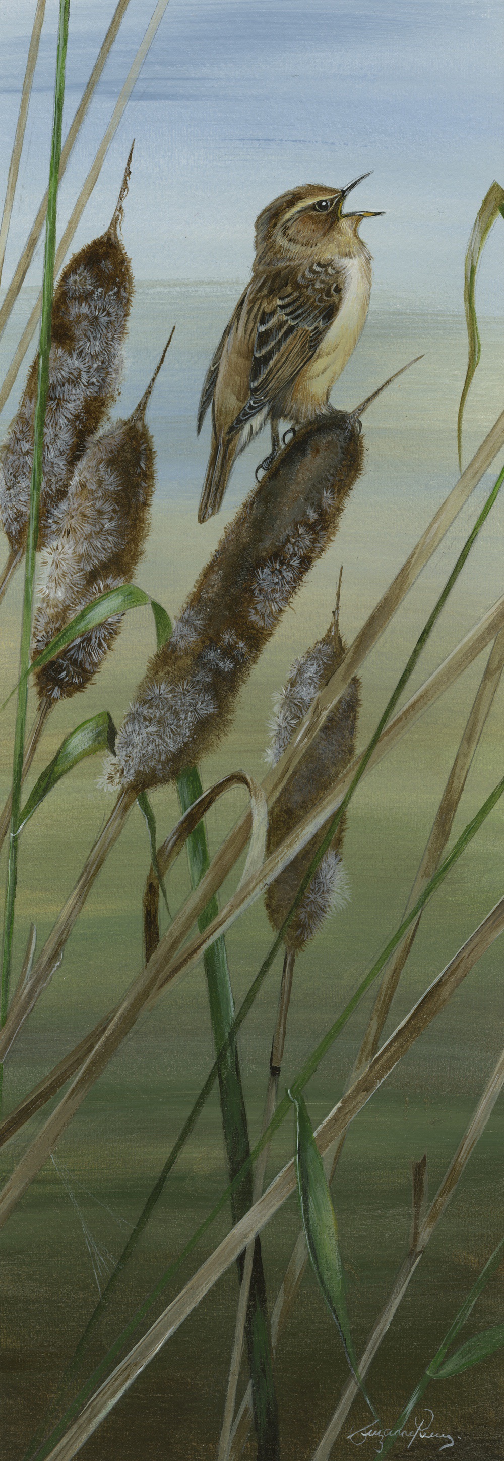 Framed Size 21" x 9", with non reflective glass. My painting tries to capture the full thrust of his singing, successfully I hope. The sedge warbler is a small, quite plump, warbler with a striking broad creamy stripe above its eye, and greyish brown legs. It is brown above with blackish streaks and creamy white underneath. It is a summer visitor, and winters in Africa, south of the Sahara Desert. Its song is a noisy, rambling warble compared to the more rhythmic song of the reed warbler. Read more.....RSPB Sedge Warbler