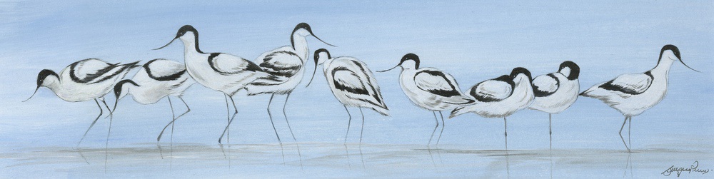 Framed size 9" x 21", with non reflective glass. I have been wanting to paint avocets for some time now, so here is my first colony! Surely a painting to lift you on a dull day? SOLD at the Hadleigh Show.