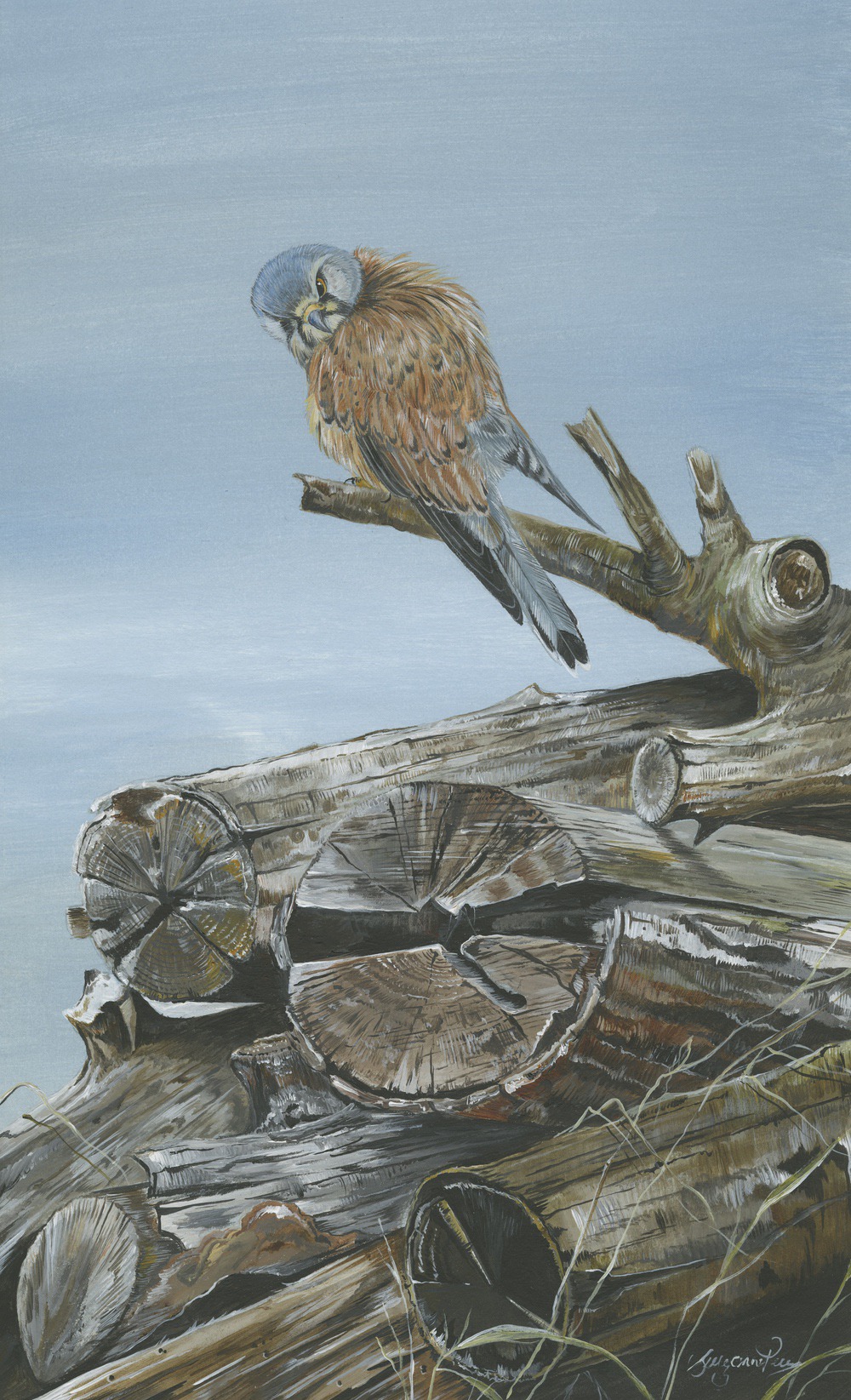 Framed size 18" x 12", with non reflective glass. I have wanted to paint a wood pile for a while and this preening male kestrel was the perfect choice to add some colour contrast. I have named my painting after the 1969 film "Kes" which was about a young boy caring for and training his falcon. SOLD