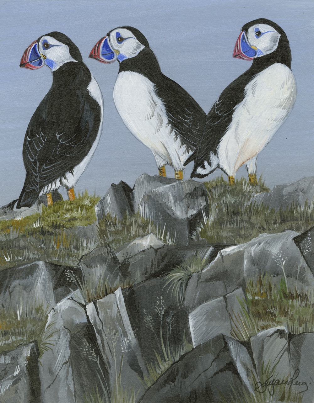 Framed size 10" x 8", with non reflective glass. The Circus painting has been so popular that its limited edition run of 25 now sold out. What better start to a new range of smaller picture than to choose Puffins as the subject! In my Circus they do indeed look like clowns. In this one I thought they had a rather gentlemanly presence, standing there on the rocks. SOLD at the Suffolk Show.