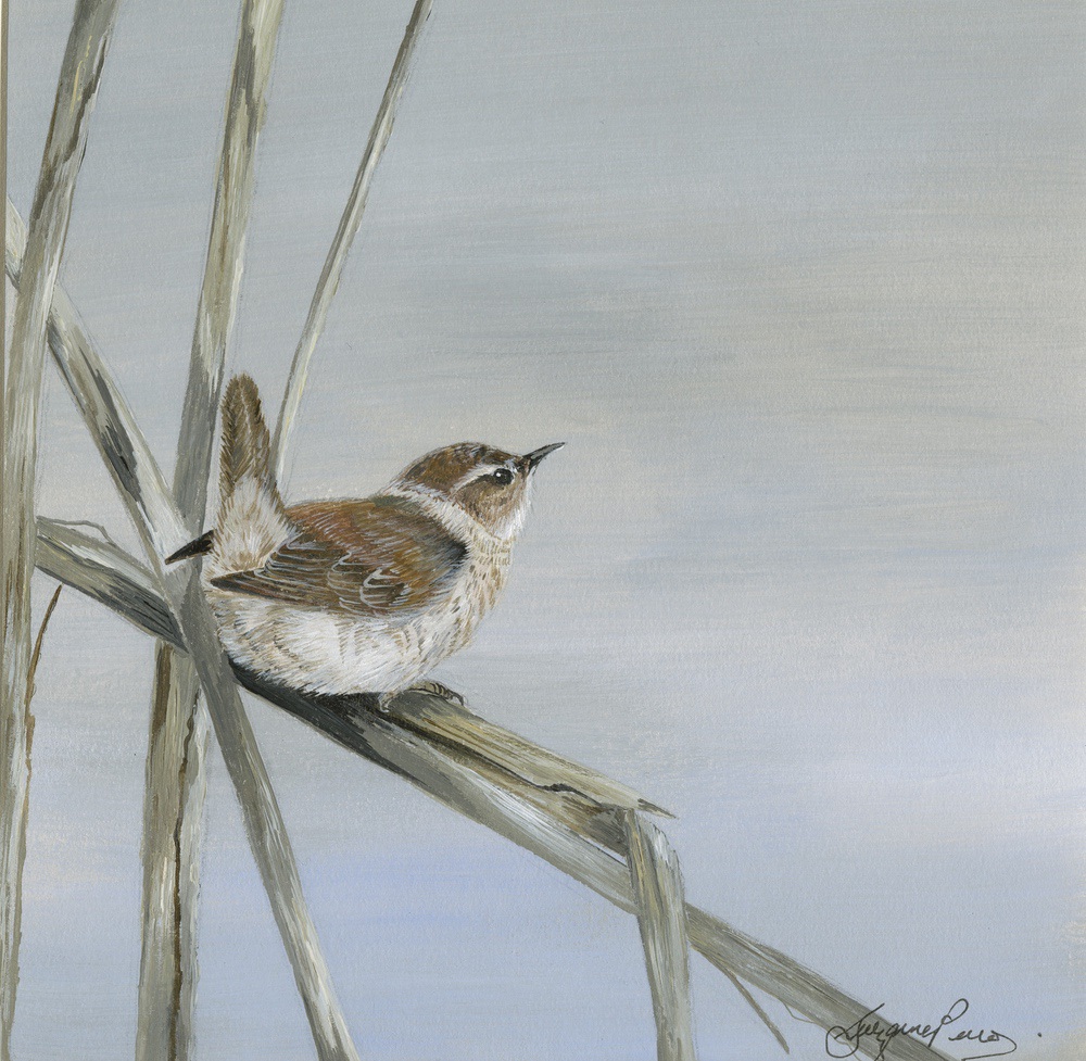 Framed Size 12" x 12", with non reflective glass.  I hope the simplicity of this painting appeals, the idea just came to me.  I love it!  In a smaller, square frame, it definitetly has it place! SOLD at the Hadleigh Show.  The wren is a tiny brown bird, although it is heavier and not as slim as the ...Read more