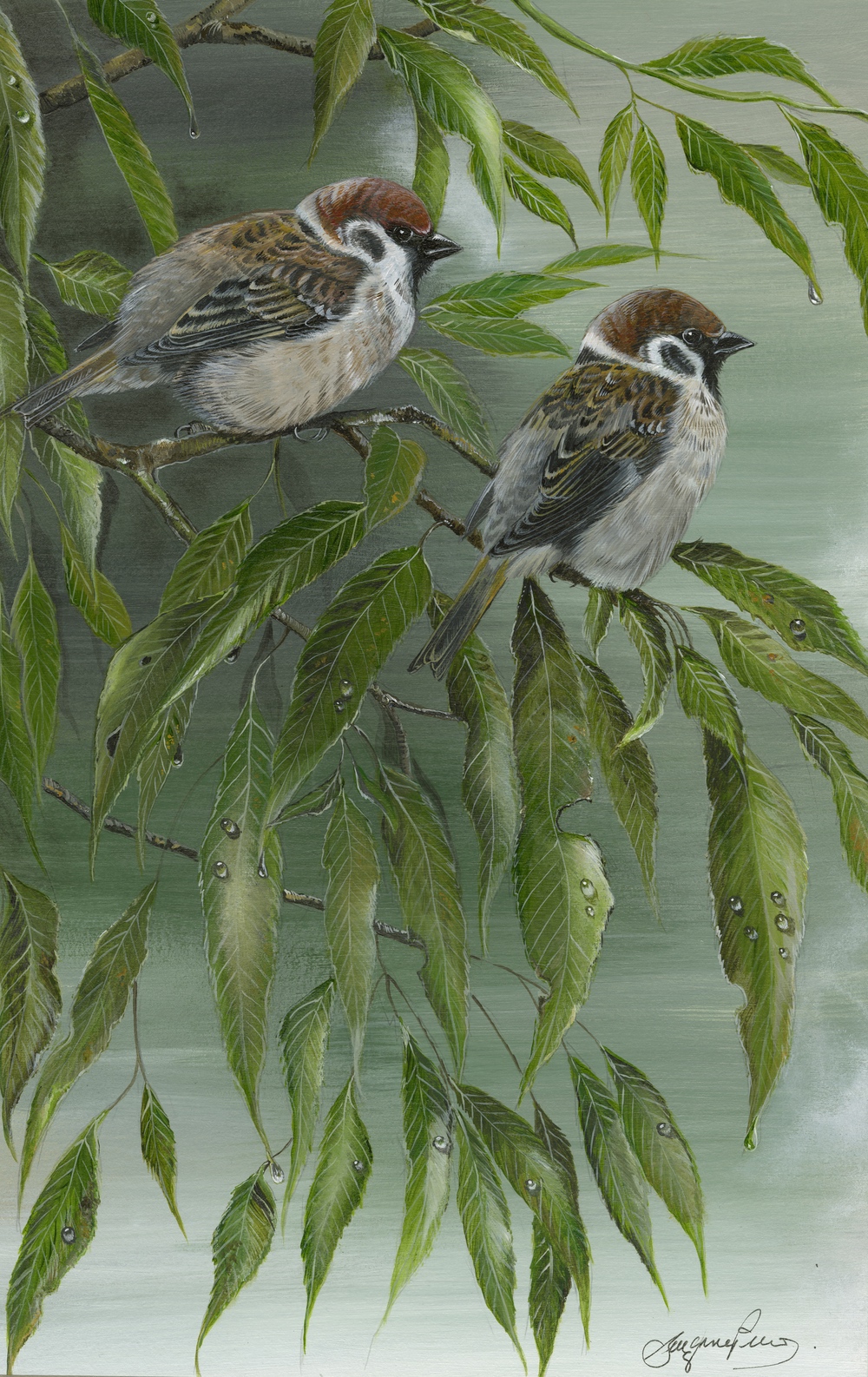 Two Tree Sparrows sheltering afters the rain stops, droplets still seen on leaves., framed size 18" x 12" with non reflective glass. The painting is on Cold Press, extra heavy, off white Crescent art board and I aim to produce the finest detail in both the subject and its natural setting. The shade of the Daler mountboard is carefully selected depending on the painting, as is the toning of the frame itself.