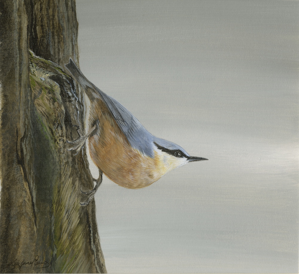 Framed size 12" x 12", with non reflective glass. The simplicity of this painting appeals to me, the nuthatch being my favourite bird. On our visits to Pensthorpe we have sat in one of the hides, waiting for them to appear and they did....eventually! SOLD at Birdfair 2019