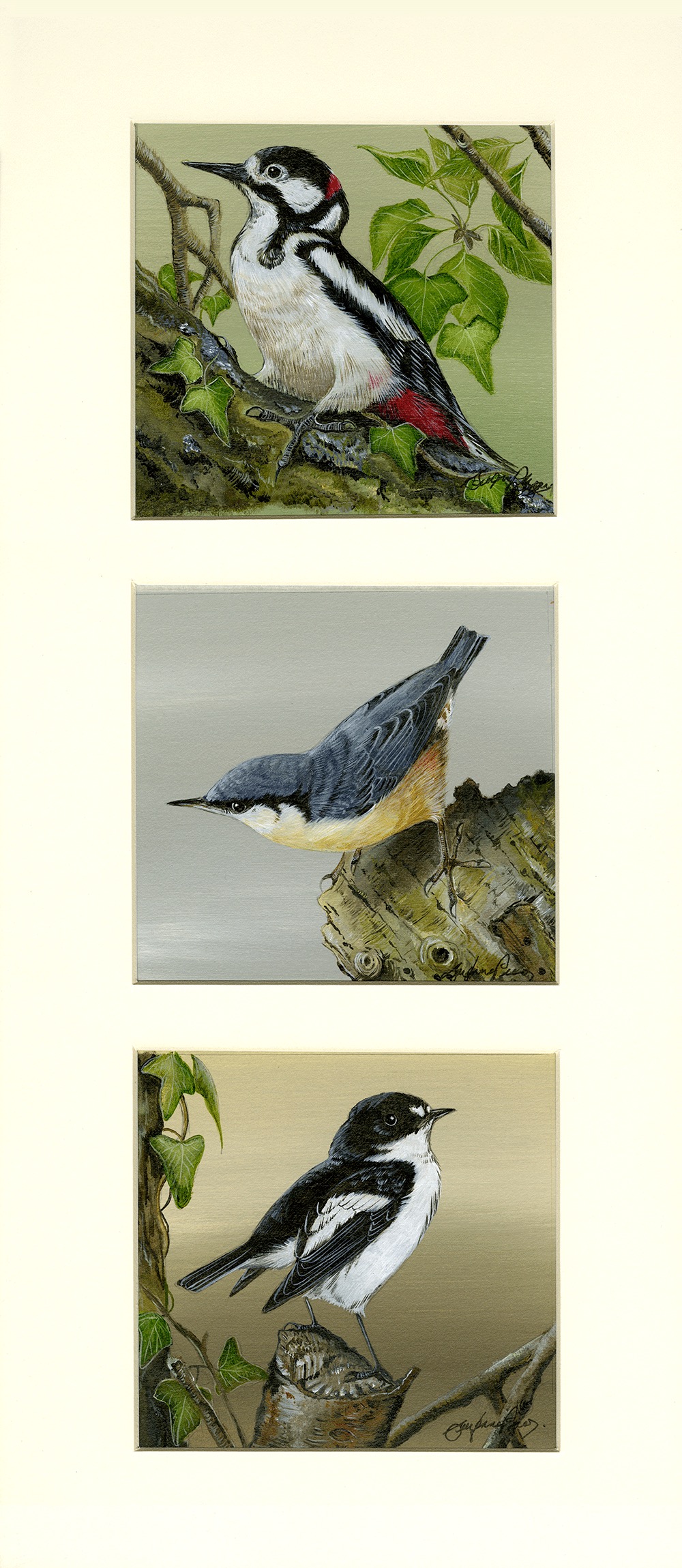 Framed Size 21" x 9", with non reflective glass. I now have painted a new collection of woodland favourites, each bird set against a full background. You will see a Great Spotted Woodpecker, Pied Flycatcher and the delightful Nuthatch. I make no excuse for repeating this theme, hopefully displaying ever more detail. Should you wish to have your own choice of woodland birds, I am always open to suggestions! SOLD Privately