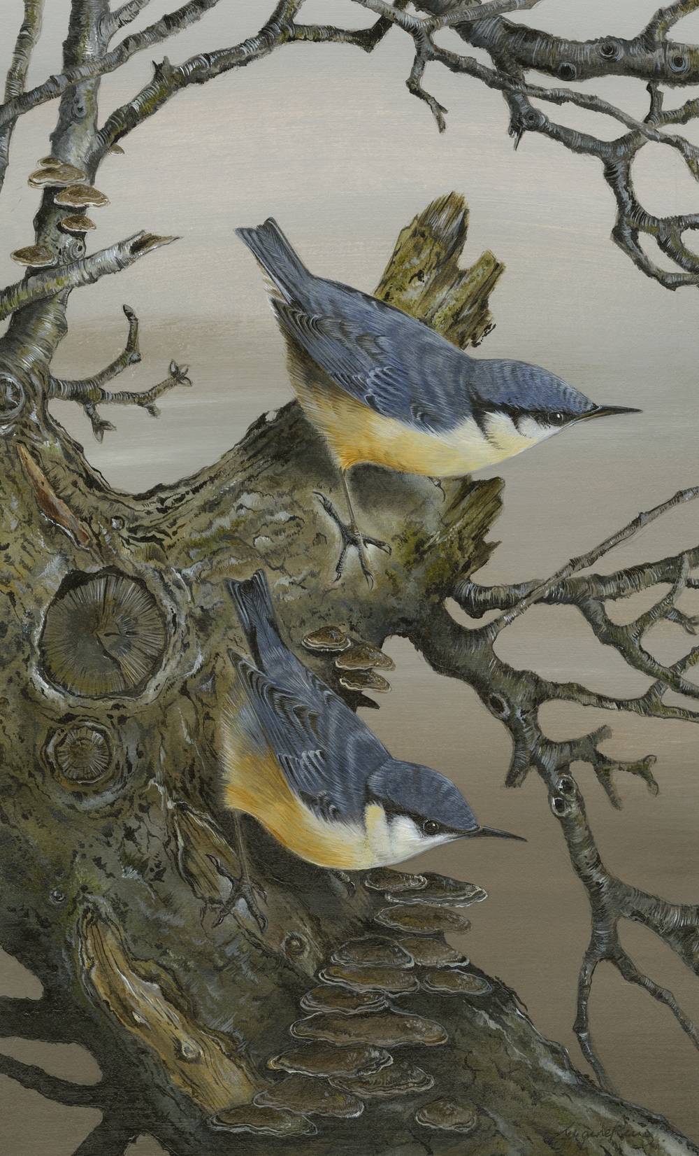 Framed Size 18" x 12", with non reflective glass. I offer no excuse for another Nuthatch painting, this time this cheeky pair.