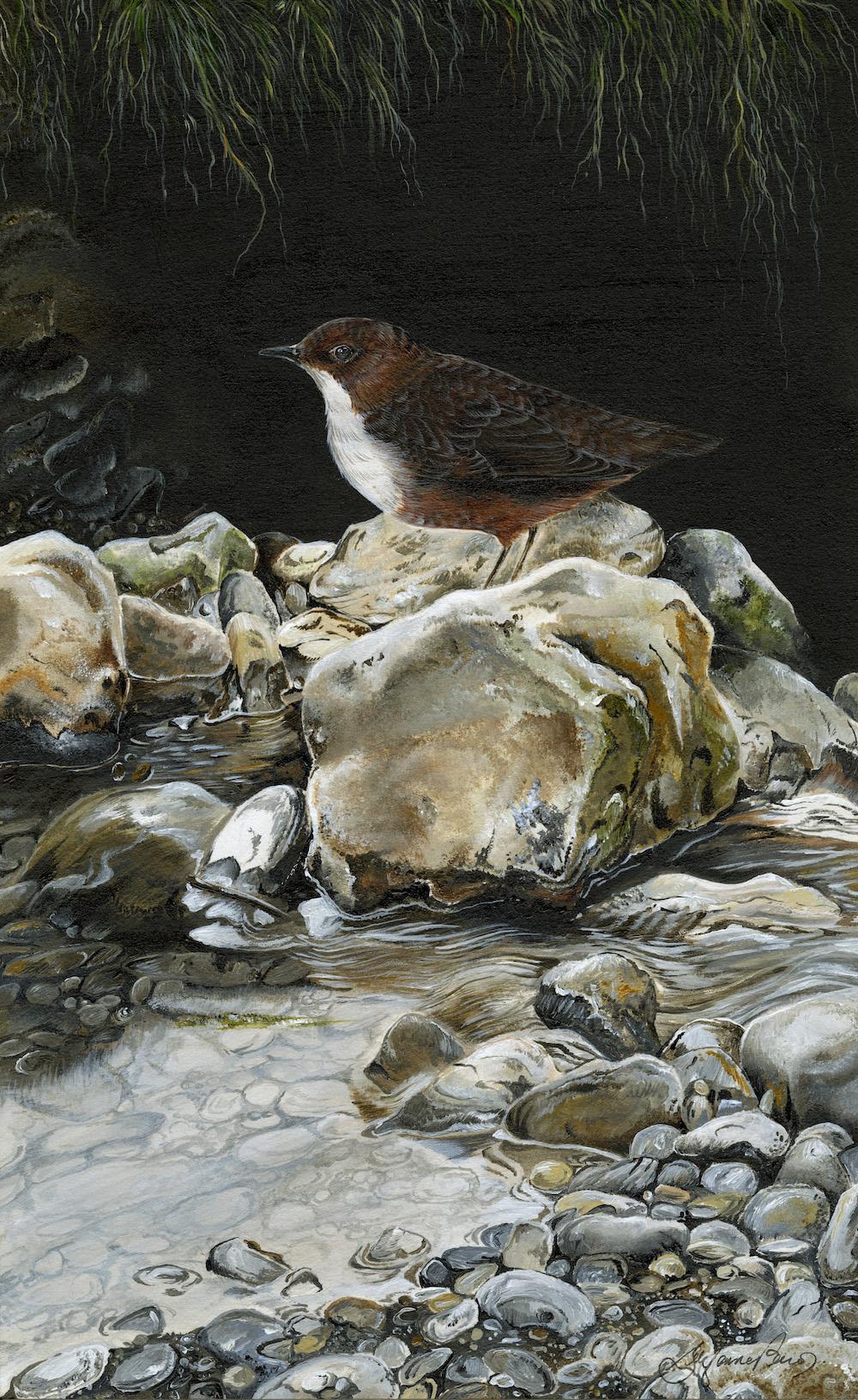 Framed size 18" x 12", with non reflective glass. Dipper Splash! The painting is on Cold Press, extra heavy, off white Crescent art board and I aim to produce the finest detail in both the subject and its natural setting. The shade of the Daler mountboard is carefully selected depending on the painting, as is the toning of the frame itself. SOLD privately.