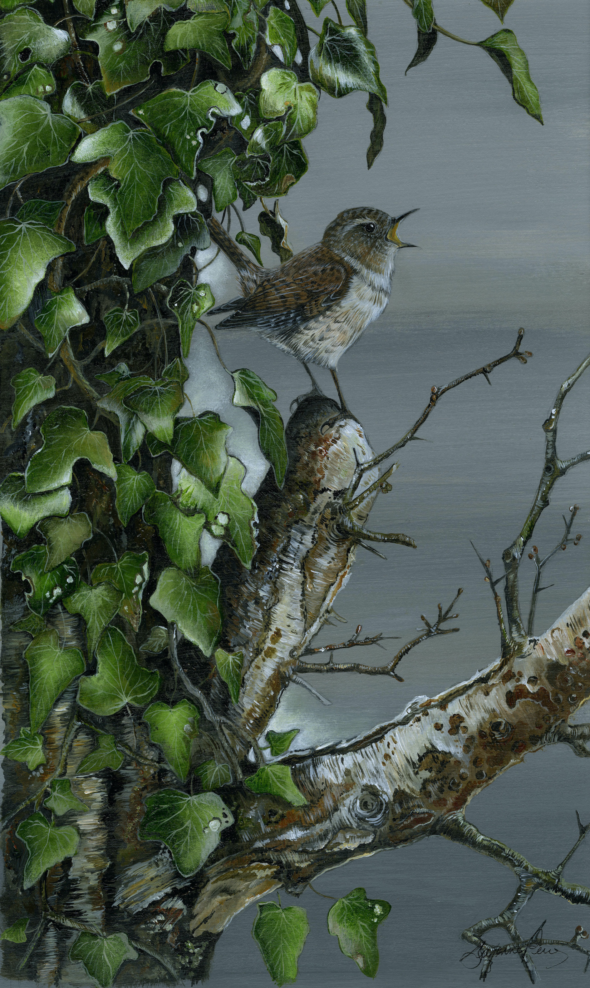 Framed size 18" x 12", with non reflective glass.   The title of this Wren picture says it all. The painting is on Cold Press, extra heavy, off white Crescent art board and I aim to produce the finest detail in both the subject and its natural setting.  The shade of the Daler mountboard is carefully selected depending on the painting, as is the toning of the frame itself.